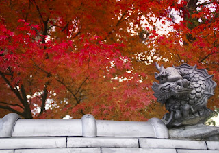 Here is the Temple's garden. This garden, as with any proper Zen garden is a direct reflection of something in nature. This particular garden is a reflection of Heian shrine. It also has two bushes within the garden which represent the two Shinto creator gods, Izanami and Izanagi. He also explained how Shinto and Buddhism merged so well; Shinto did not have any standard ethical or moral precepts, whereas Buddhism did. So, when the two 'religions' met, they married together quite easily.