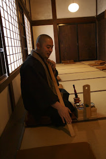 On Sunday I went to Shukoin Temple which is part of Myoshinji Temple. Myoshinji Temple is where Suzuki had many discussions regarding Zen buddhism and is seen as the place Rinzai Zen emerged from. This is Takafumi Kawakami, the vice abbot of the Temple who showed me Rinzai Zen's way of doing zazen. Here he is holding the kaiseki, which is used to strike monks on the shoulders at certain pressure points if they are getting sleepy, or their posture breaks during zazen. I enjoyed my time at Shunkoin as I was the only one there, which made it feel even more special.